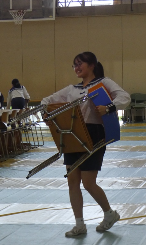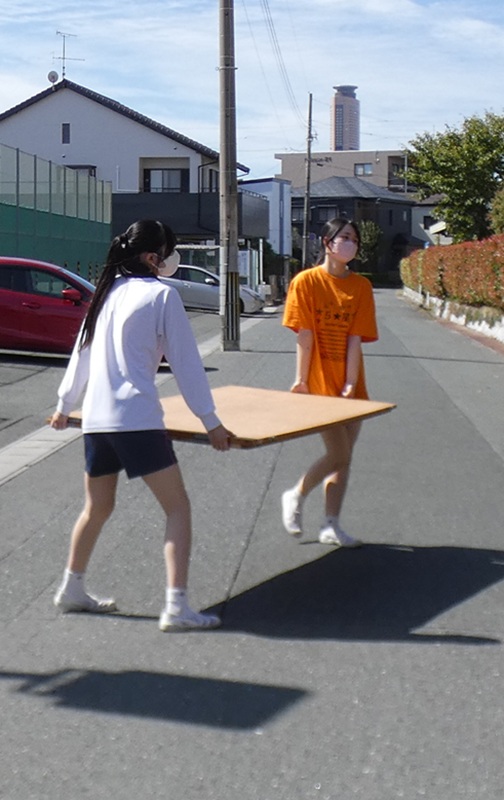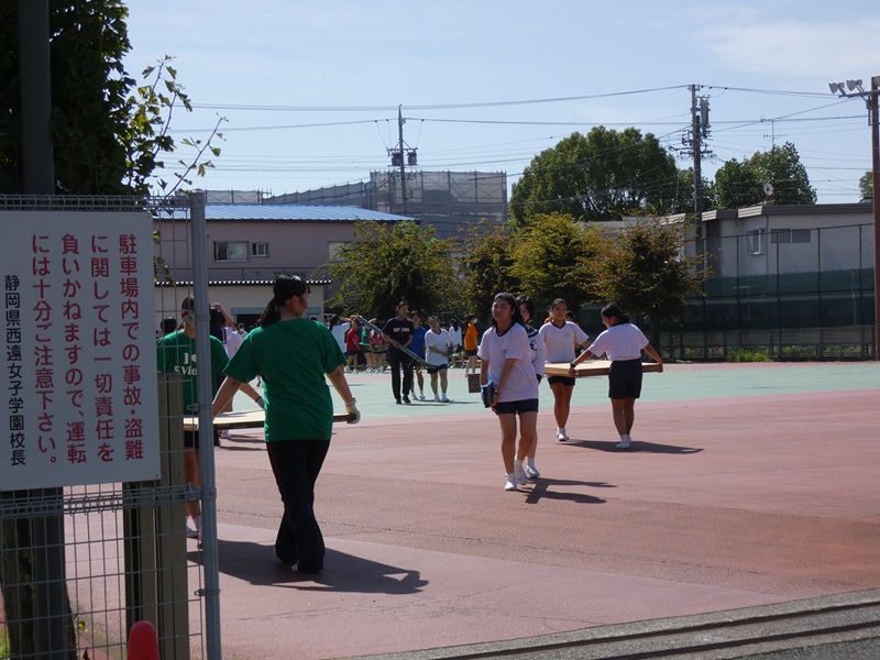 南グラウンドからついたてと脚を運ぶのは、一番の重労働! でも友達と声を掛け合いながら、笑顔で運んでいます。ステキです。