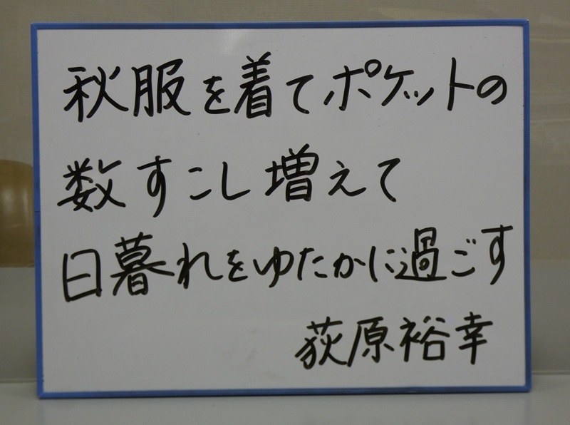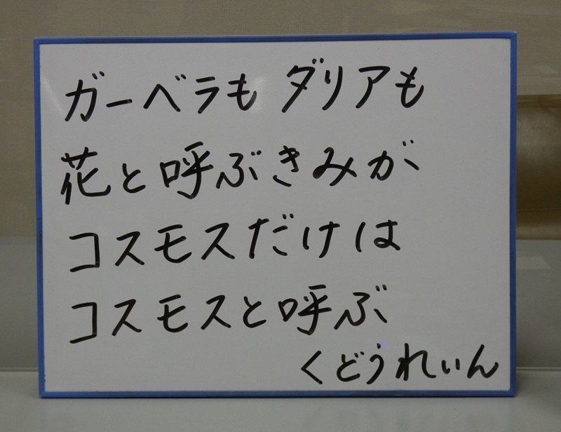 9月最後の白板はこの短歌にしようと、だいぶ前から決めていました。花には全く興味がないのにコスモスの名前だけは知っている「きみ」。そんなきみへのいとしさを感じる短歌です。猛暑のせいか、コスモスも今年は遅そうですね。秋風に揺らめくコスモスの花を早く見たいです。