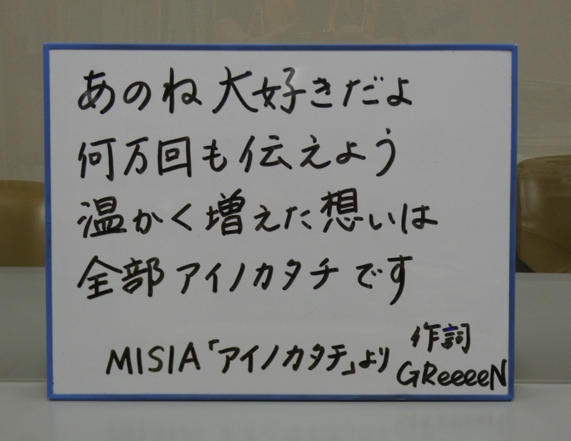 学園祭前日、この歌を書きました。いろんな確執もあった何か月かを経て、ついに学園祭が幕を開けます。愛の形はいろいろあるよ、みんな大好きだよ、の気持ちを込めて。学園祭の間、図書館の入り口はPTA模擬店の店先になりますので、白板は撤去されています。そこで、学園祭の2日間は、この歌詞を消さないで校長室に白板を飾っていました。だから、私の頭の中では、学園祭の間中、この歌がエンドレスで流れていました。