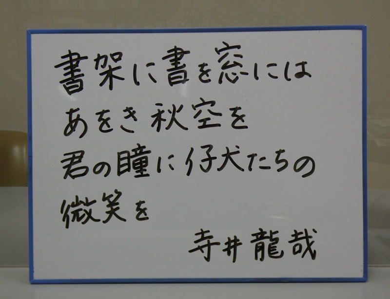 前期最後の白板は、書と秋空と仔犬たちの微笑をプレゼント。忙しい前期でした。素晴らしい学園祭でした。良い秋休みを! 勉強ももちろんですが、「読書の秋」ですから、ぜひ読書もしてくださいね。