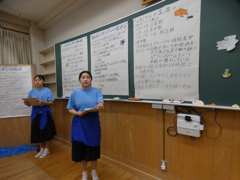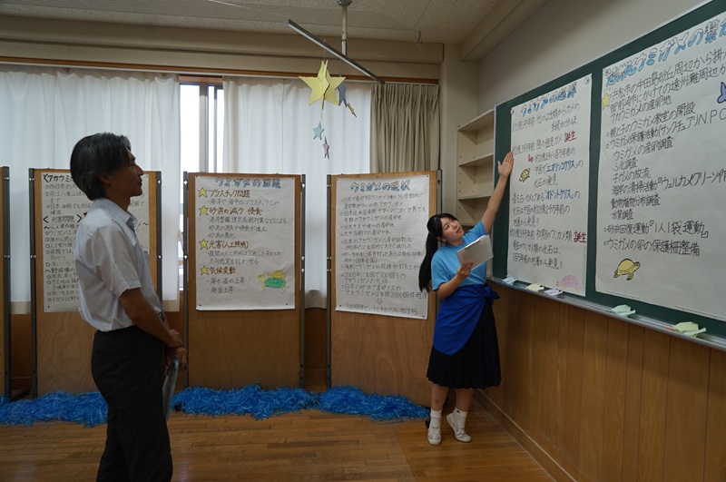 ウミガメについて留学生の方々にアンケートを行ったり、他の国のウミガメ保護の状況を紹介したり、「地域と世界の比較」という課題に対して努力のあとがみられました。