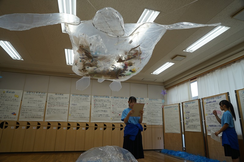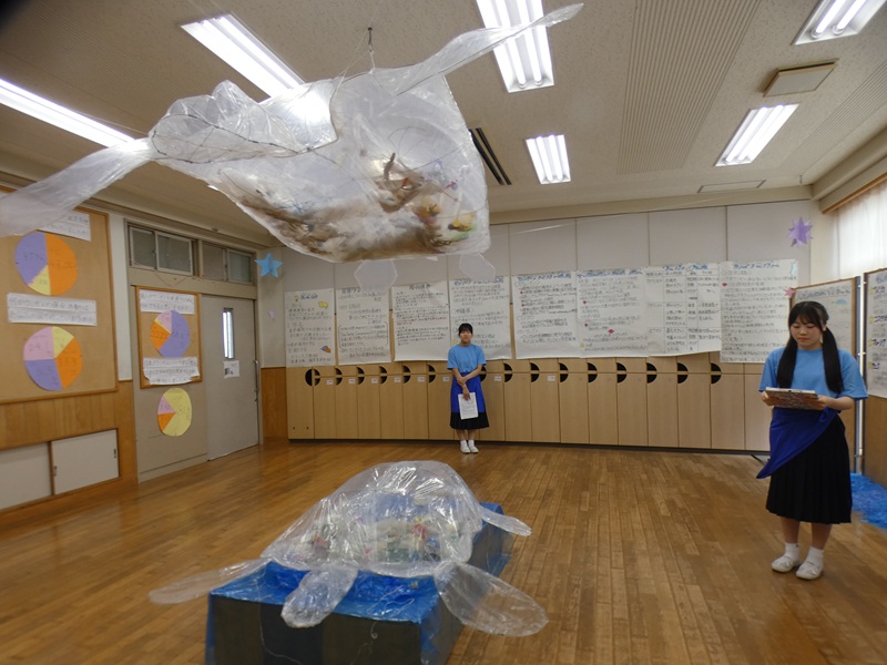 中田島砂丘に足を運んだ生徒たちは、ゴミの回収ボランティアを行いました。そして、その一部を、制作物に入れたのです。教室中央、2頭のウミガメには、中田島の海岸のごみが詰められています。この透明のカメは、4年菊組から私たちへの警告でもあります。