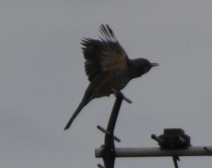 けたたましく鳴いているヒヨドリの声がしたので、どこで鳴いているのかなとカメラで探しました。近所のアンテナの上で、にぎやかに鳴いていました。なんてしゃべっているのだろう?鳥語が知りたくなります。