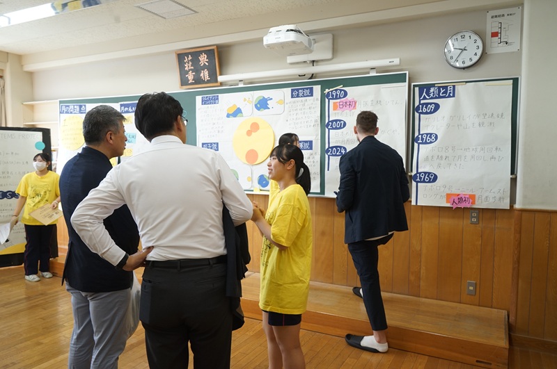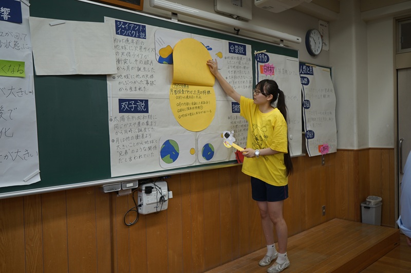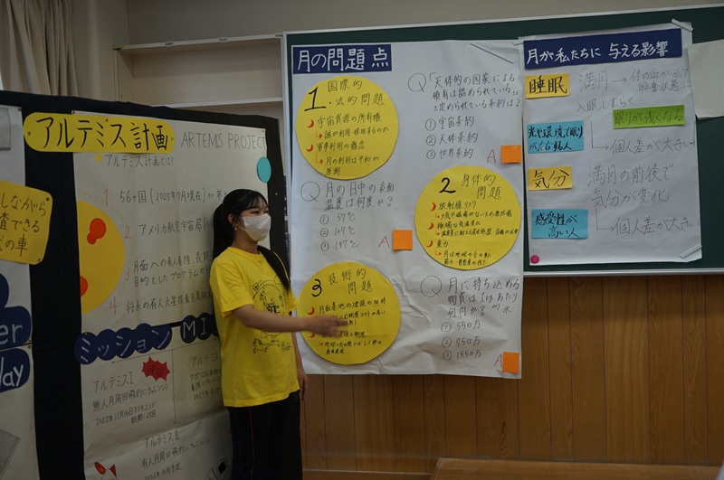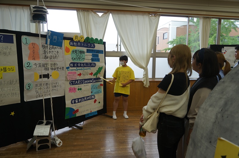 月は、人類の一つのあこがれの地でもあります。月の成り立ちや、開発の歴史を紹介しながら進む教室。実際に月を目指し、様々な研究が進んでいることを、このHR展を見学することで知ることができました。丁寧に説明する姿勢が見られ、「みんな、プレゼンテーションがうまい!」と審査員をうならせました。