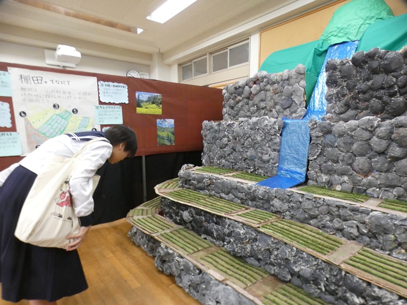 ◎棚田がとても素敵でした。ミニチュアとはいえ、大掛かりな制作物でしたが、細かい田んぼの雰囲気が出ていました。クラスで協力、サポートしあい発表に取り組んでいたこと、一生懸命さがとても伝わってきました。