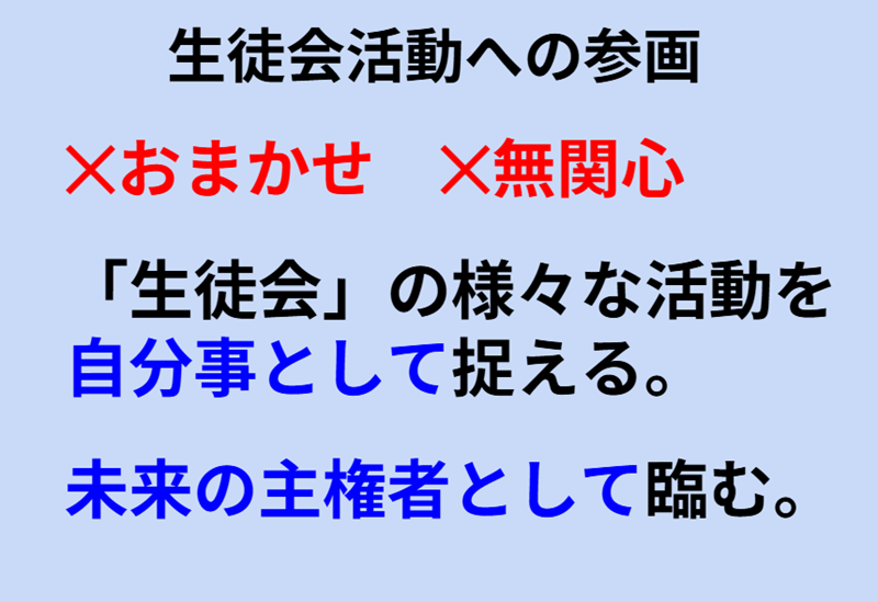 生徒会活動が、ともすれば「行事」「イベント」化している今の流れの中で、生徒会規約の原点に戻り、活動の意味を深く捉えてもらいたかったのです。