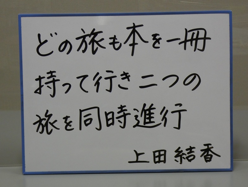 私も旅に出るときには本を持っていきますが、実際の旅と、本の中の旅、同時に進行する二つの旅って、実はとても贅沢なことなんだなあと改めて思いました。2007年の津和野への旅には、中原中也と森鴎外と安野光雅の本3冊をもっていって、往復の山陽新幹線で読みましたっけ。カナダに行ったときには、機内で読んだジュニア新書「祖母・母・娘の時代」に涙したことを覚えていますし、イギリスへの機内で「イギリスはおいしい」(林望)を読んで、イギリスの料理がいかに不味いかを知ってしまい、激しく動揺したことも忘れられません。上田結香さんの短歌に、いろんな旅の記憶を蘇らせることができました!