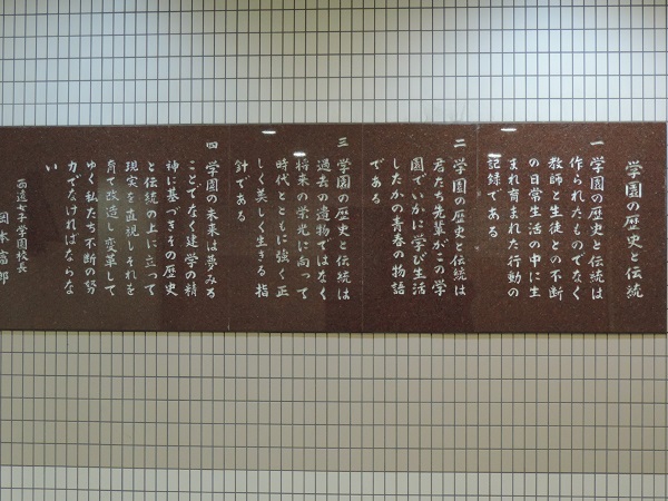 ◎図書館下にある学園の歴史と伝統は中学1、2年生の頃は友達が職員室に行って待っている間によく読んでいましたが、学年が上がるにつれ、読んでいなかったなと言うことに気づくとともに、この言葉の意味を改めて考えさせられました。(高校1年)