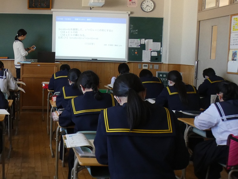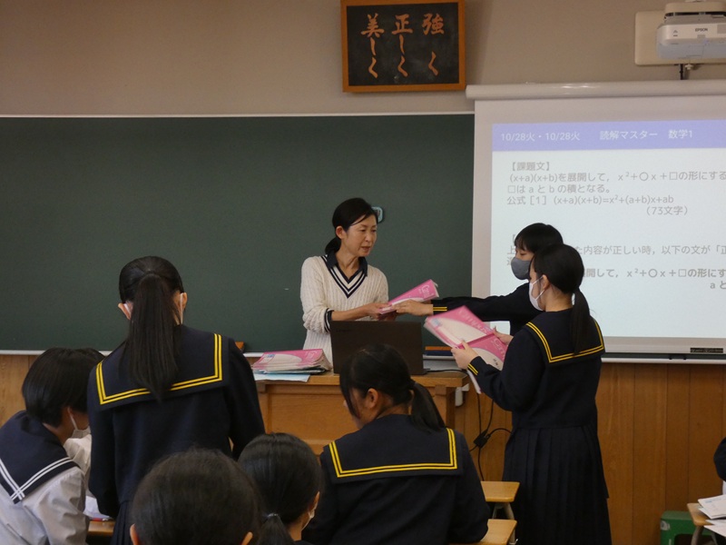 7時間目、中3の「読解マスター」の様子を見に行きました。リーディングスキルやシン読解力をつけてほしいという願いから始まった新たなプログラムですが、みんな積極的に頑張っていました。力はついてきたかな? 教室では、まだまだ夏服の勢力も侮れませんね!