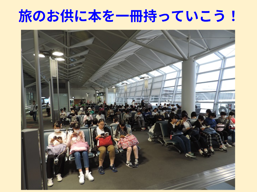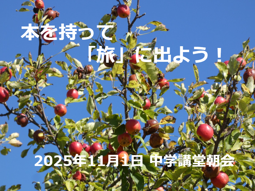 上田結香さんの「どの旅も本を一冊持って行き二つの旅を同時進行」という短歌に共感し、秋休み明けに白板に書きました。そして、読書をテーマにした講堂朝会の準備の中で、「旅」や「人生」に「本」をお供にしてほしいなと思い、今回の講堂朝会のタイトル 本を持って「旅」に出よう! が決まりました。