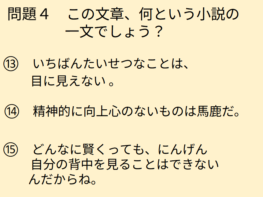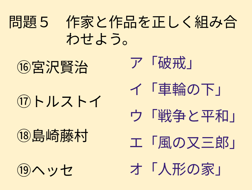 主人公の名前や名文から本のタイトルを聞く問題や、文学作品や文学者の名前の虫くい問題、そして、ノーベル文学賞受賞者を当てるものなど、全20問。中学生は頭をひねりながら解答用紙に答えを書き込んでいました。
