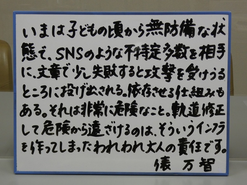 いまは子どもの頃から無防備な状態で、SNSのような不特定多数を相手に、文章で少し失敗すると攻撃を受けうるところに投げ出される。依存させる仕組みもある。それは非常に危険なこと。軌道修正して危険から遠ざけるのは、そういうインフラを作ってしまったわれわれ大人の責任です。