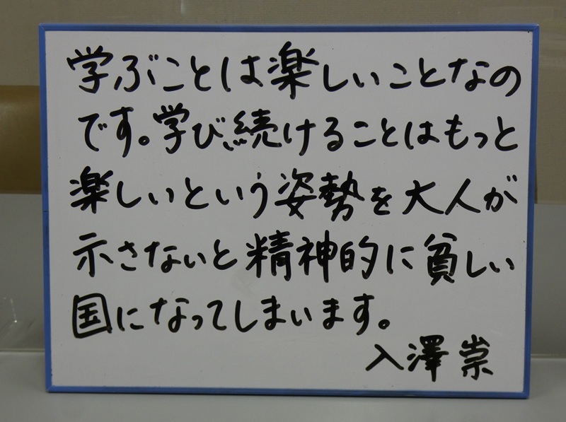 これは以前に書き留めておいた言葉。「大人の責任」という月曜のキーワードから、この言葉を翌日書くことにしました。「学ぶこと」「学び続けること」の楽しさを私たち大人が伝えていかないと、日本は大変貧しい国になってしまう…。龍谷大学理事長の入澤先生の言葉には、いつもハッとさせられます。
