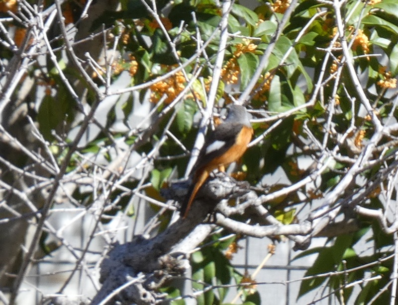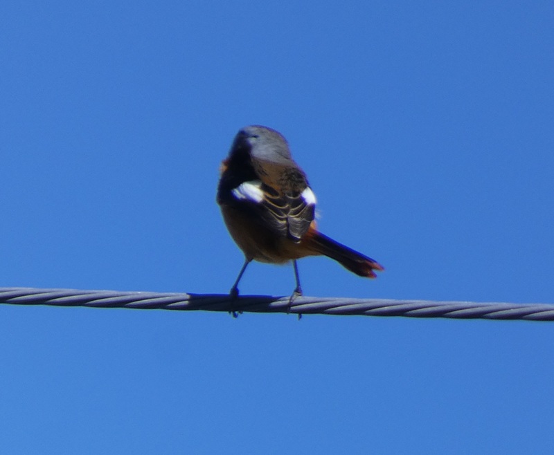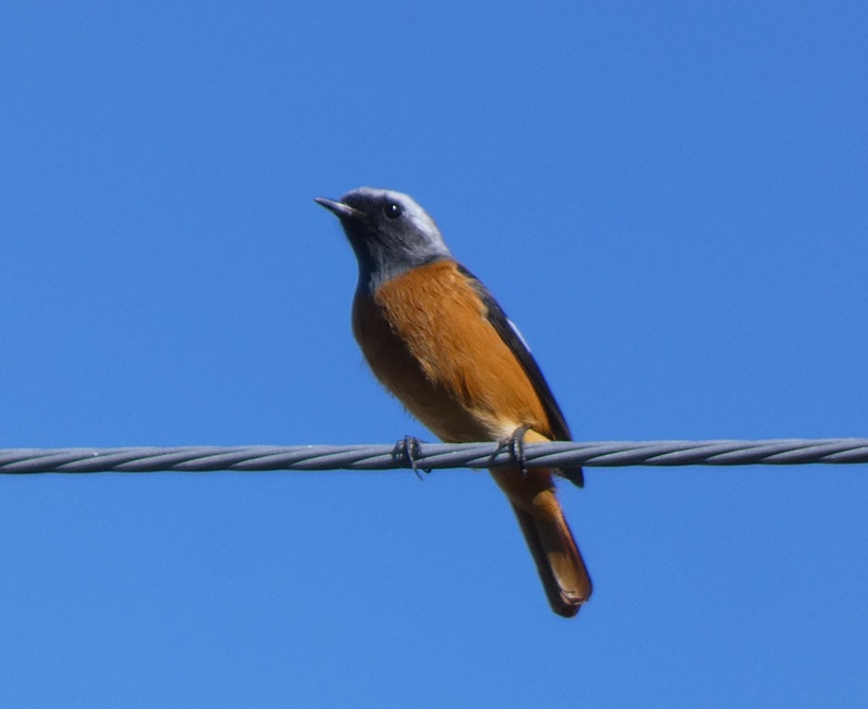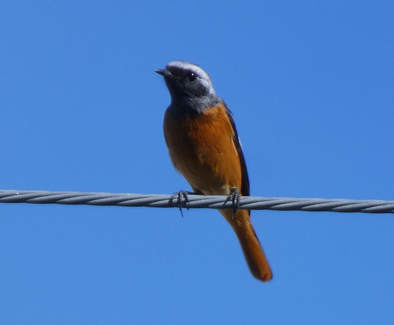 休日の西遠には、青空のもと、ジョウビタキがやってきました。鮮やかなオレンジ色のジョウビタキは、オスです。最初は、低木の中に隠れるように入っていましたが、そのうち、飛び去った、と思ったら、電線に泊まってポーズしてくれました。青い空に映えるポージングですね。