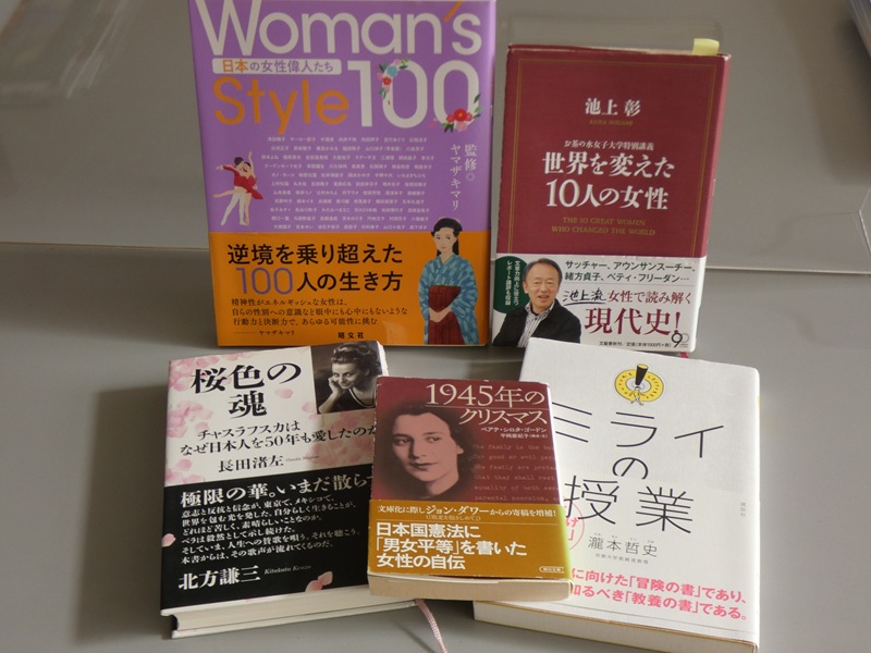 ベアテさんの関係では、「世界を変えた10人の女性」(池上彰著)、「ミライの授業」(瀧本哲史著)、「1945年のクリスマス」(ベアテ・シロタ・ゴードン著)の3冊。チャスラフスカさんについては、「桜色の魂」(長田渚左著)、そして、茨木のり子さんは「Woman’s Stayle100 の本の女性偉人たち」(ヤマザキマリ監修)です。