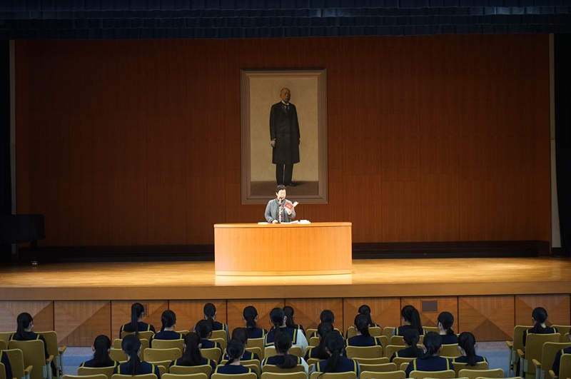 本日1時間目は、高校の講堂朝会。高校3年生がオオバの話を聞く「講堂朝会」は今回が最後です。