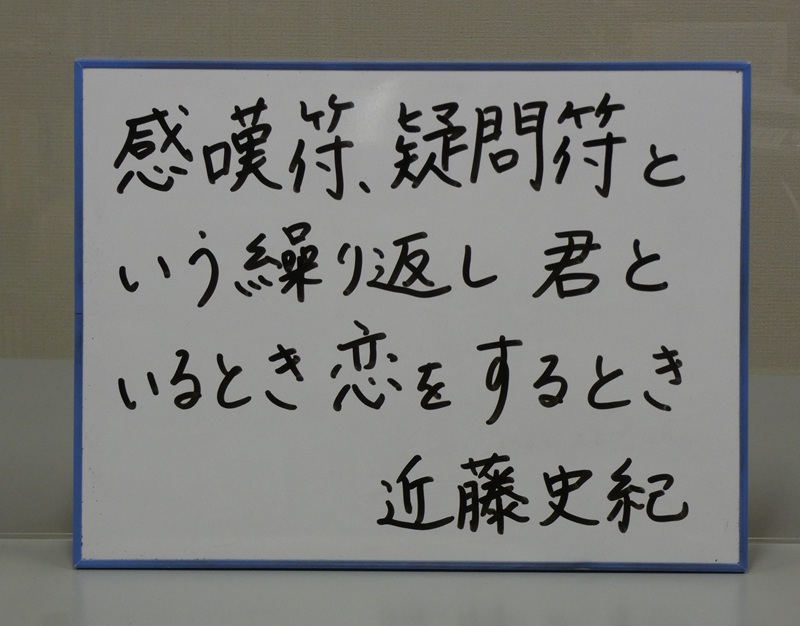 図書館入り口に掲げた「小さな白板(ホワイトボード)」。今週は人間関係を隠れたキーワードにして短歌を紹介しました。