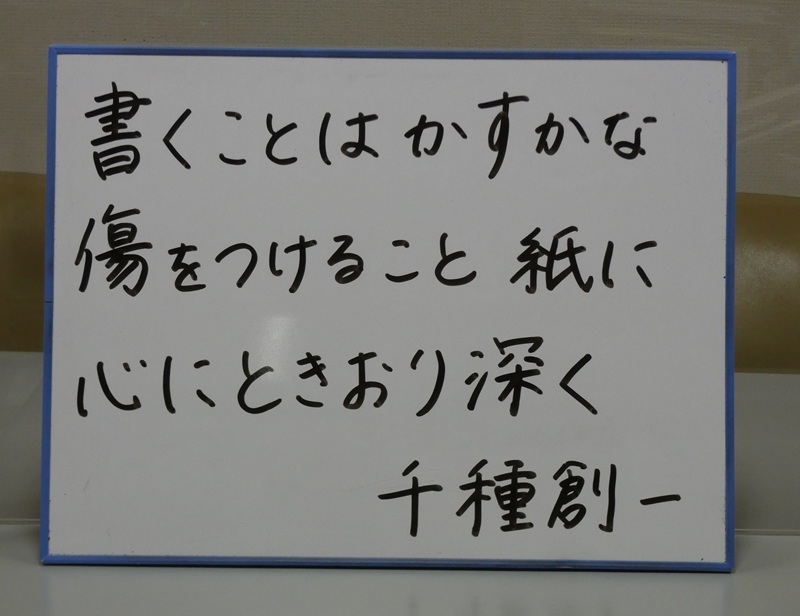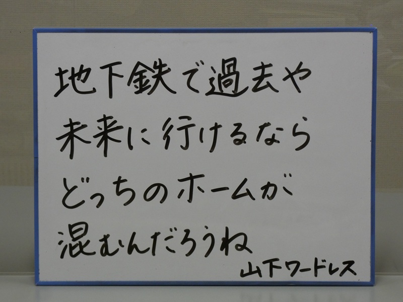 もしも地下鉄に「過去行き」と「未来行き」があったら、皆さんはどちらのホームに行きますか? この短歌を知った時、ぜひ生徒の皆さんに紹介したいと思い、白板に書きました。いろいろ想像したくなる短歌ですね。第25回NHK短歌全国大会の「佳作」となった短歌です。