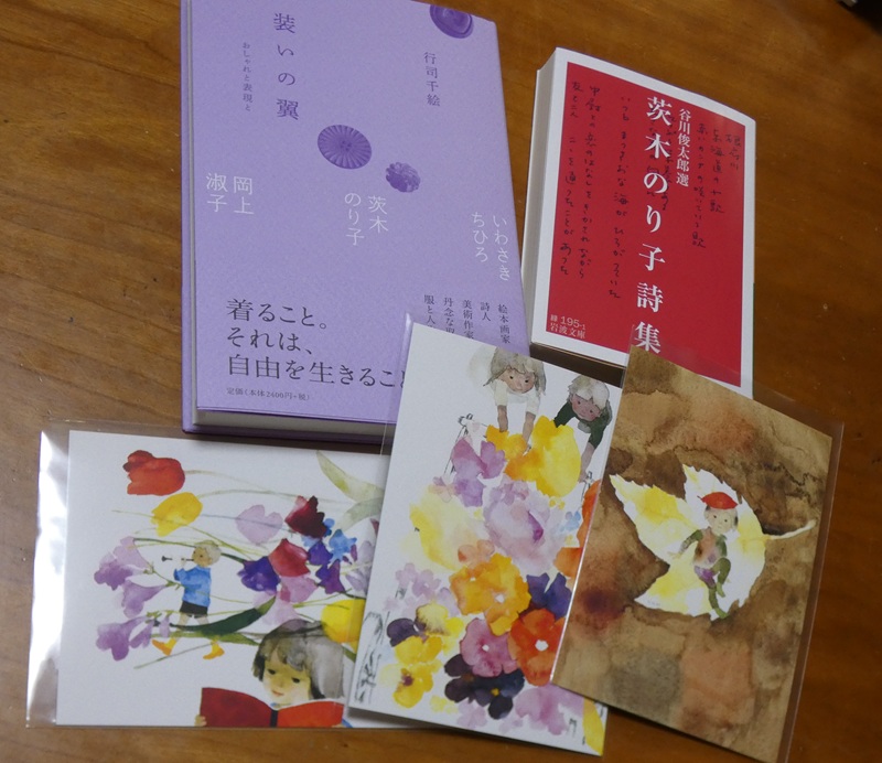 新聞記者の行事千絵さんが聞き手となって、のり子さんの甥である宮崎治さんとその妻 薫さんがマイクを持ち、詩人としてののり子さん、生活者としてののり子さんを振り返りました。行司さんは、「装いの翼」という本をお書きになっており、現在、いわさきちひろ美術館でこの企画展が行われています。この本には、いわさきちひろ、茨木のり子、岡上淑子という3人の女性の「装い」「生き方」が綴られています。