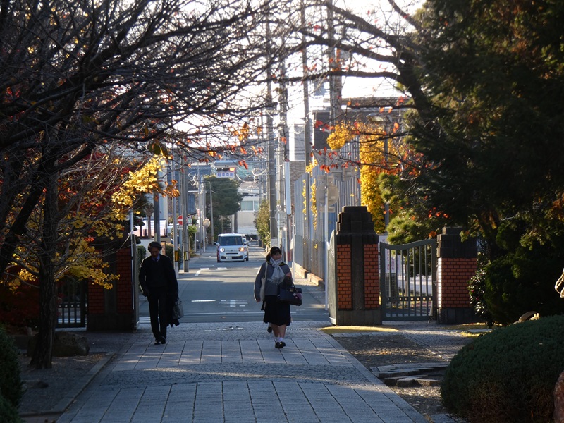 正門からのイチョウ、そして南グラウンドのイチョウも色づいていて、絵になる登校風景です。