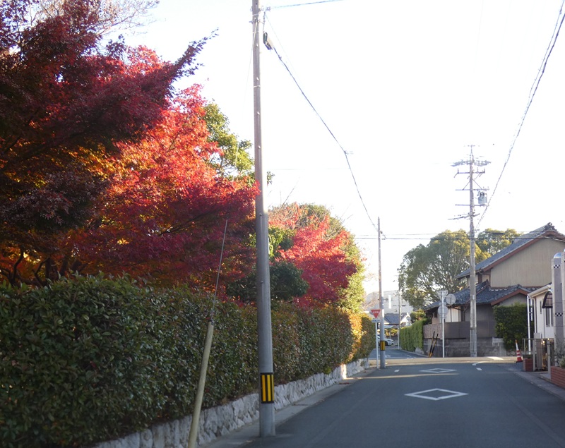 例えば、東の自転車置き場から正門への道は、今、紅葉の下を通っての登校です。下を向いていると、気づきませんよ。