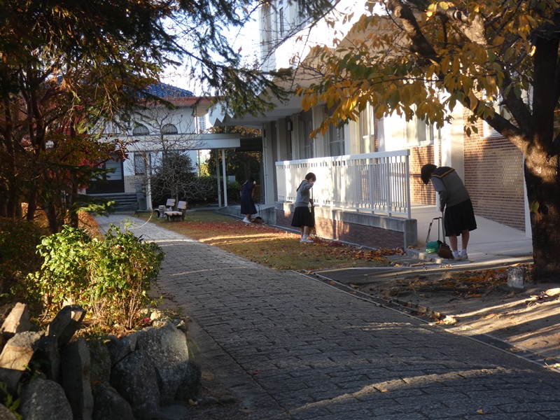 バレー部は今日も落ち葉を掃いて集めてくれています。今日は、講堂の南側のモミジや桜の葉を集めてくれました。