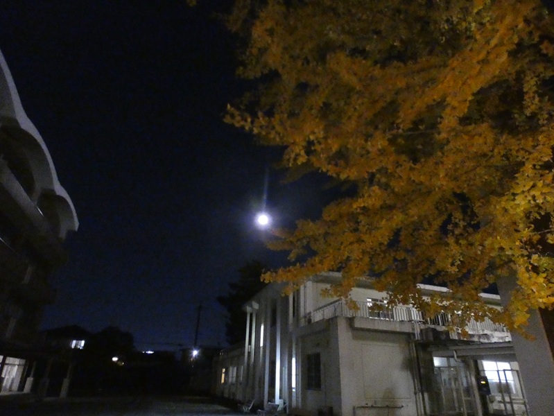 【追記】夜の美しさもどうぞ。いちょう広場のイチョウと14日目のお月さまです。