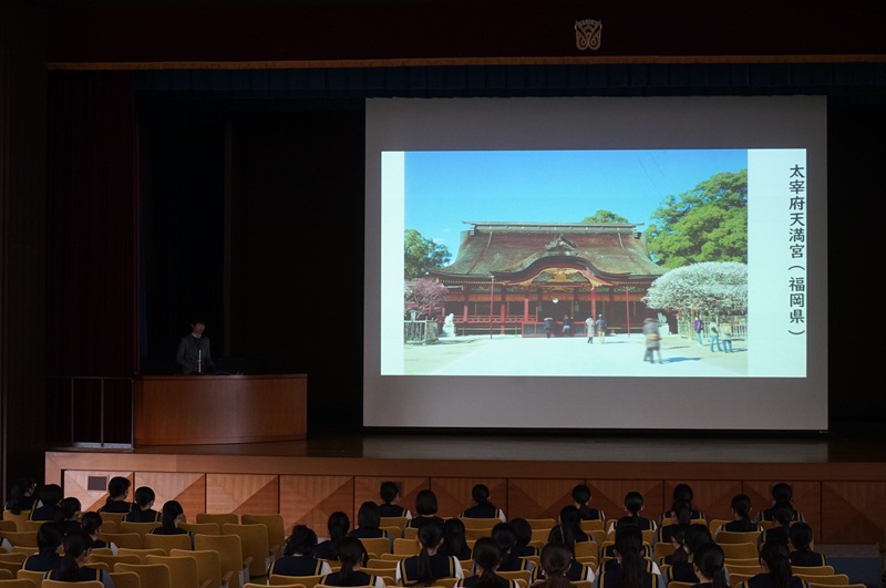 そして、さだまさしに「ドはまり」したというお話では、「飛梅」「防人の詩」の歌詞が紹介されました。太宰府を思い出した上級生も少なくなかったでしょう。そして、「飛梅」の深いお話を調べてみたくなった下級生も多かったはず。