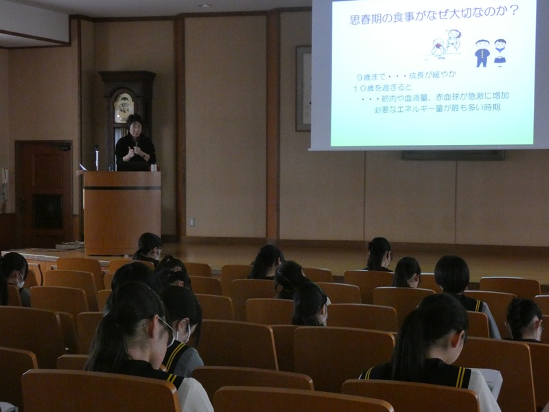西遠では、女性の体と心を知るための「健康講座」を行っています。高校1年生は「食生活と健康」について、高校2年生は「更年期」について学びました。講師は、西遠の保健体育の教師として長く勤められた白柳先生です。