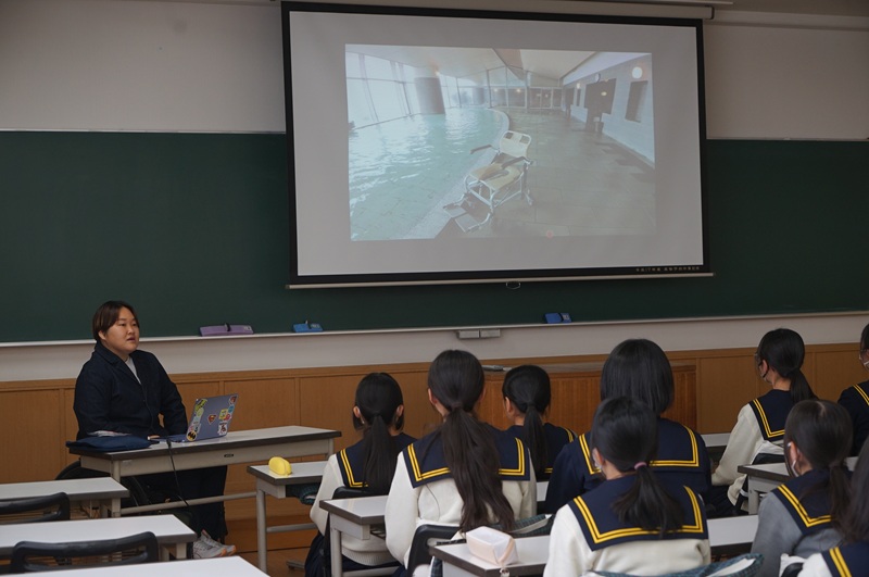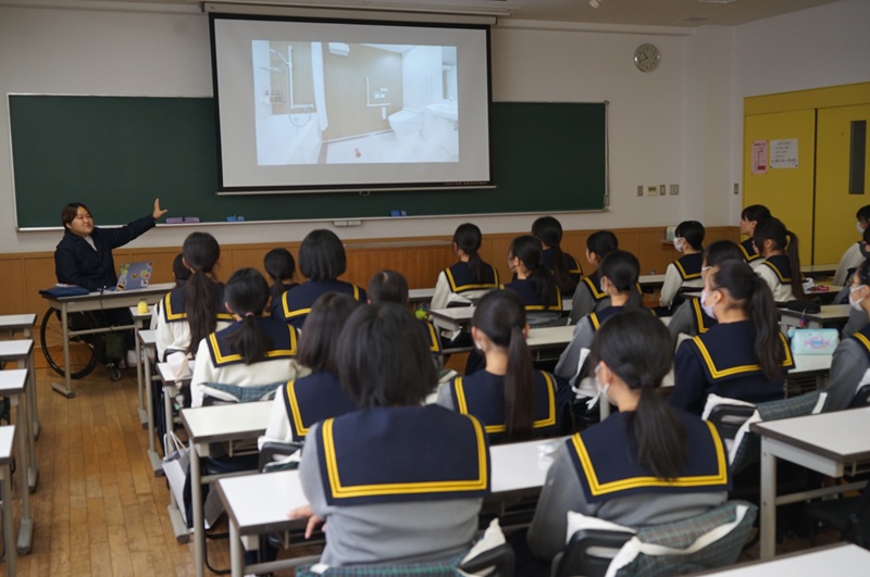 授業の最初は、「車いすユーザーとして見た世界」。様々な街の風景が、実は車いすユーザーには不便であったり、利用できなかったりすることを、生徒たちは知りました。コインパーキング、温泉施設、舗装道路も。ユニバーサルトイレでさえ、ボタンや水道に手が届かなかったり、バーが邪魔になって移動しにくかったりという実情がありました。「昔より便利になって、みんなが暮らしやすい社会になっていると思ったのに、そうじゃなかったんだ」と生徒たちは、驚き、新たな視点を得ました。