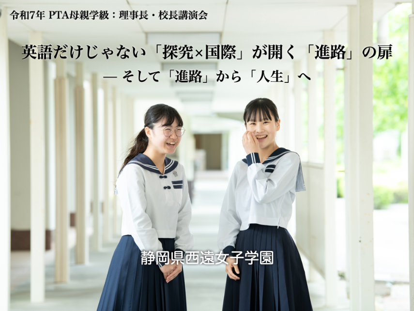 本日、PTA母親学級の12月講座が行われました。12月講座は、恒例「理事長・校長講演会」です。本日の講演タイトルは、「英語だけじゃない「探究×国際」が開く「進路」の扉 ~ そして「進路」から「人生」へ ~」――来年4月から始まる高校の「国際探究コース」を立ち上げた根拠や意義、そして西遠の教育の実践内容を多角的に紹介しました。