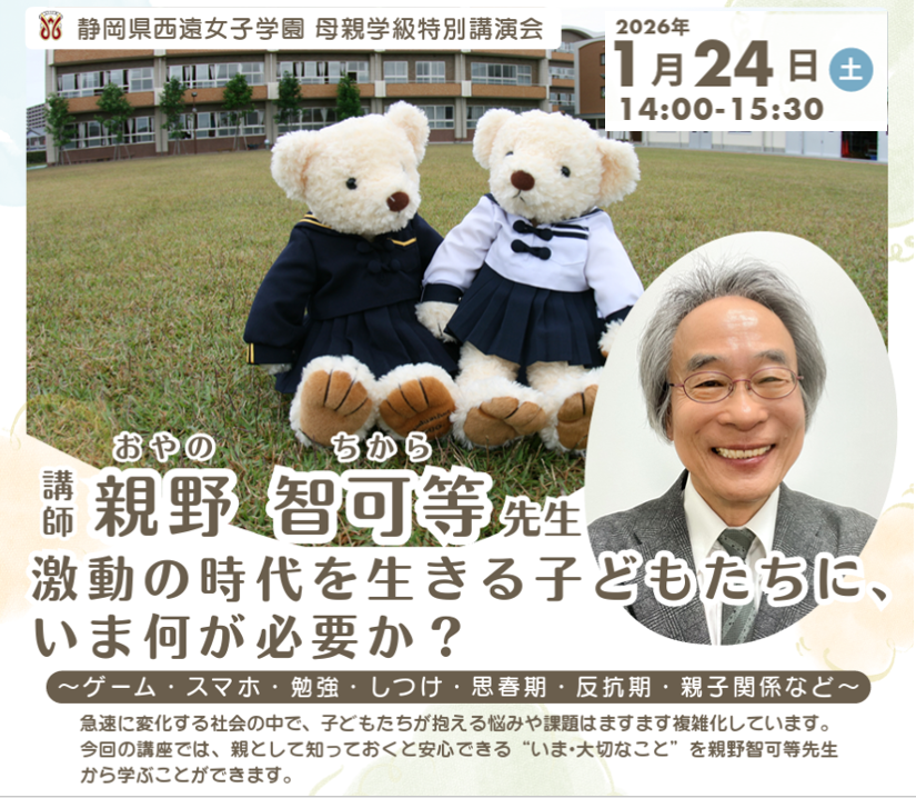 2026年1月24日(土)、西遠女子学園の母親学級が主催する「教育講演会」に、教育評論家でおなじみの親野智可等先生がご来校くださいます。