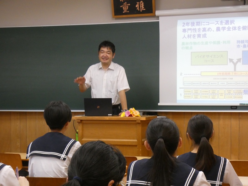 静岡大学 農学部 生物資源科学科教授の中塚貴司先生は「バイオテクノロジーで見えてきた花の魅力」というテーマでのお話。ガーベラの花をご持参くださり、生徒たちは違う角度から「花」を知ることができました。