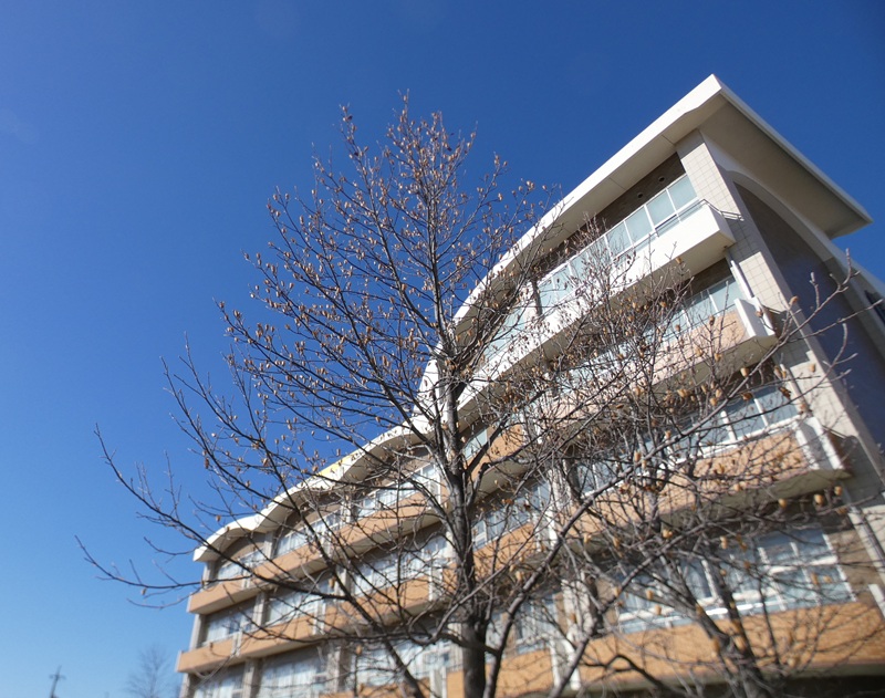 南館とメタセコイヤ。葉が落ちて、壁面の校章がくっきり見えます。