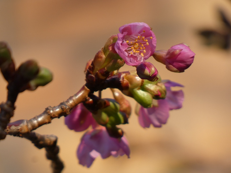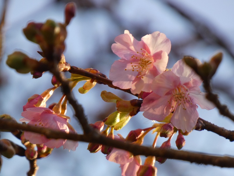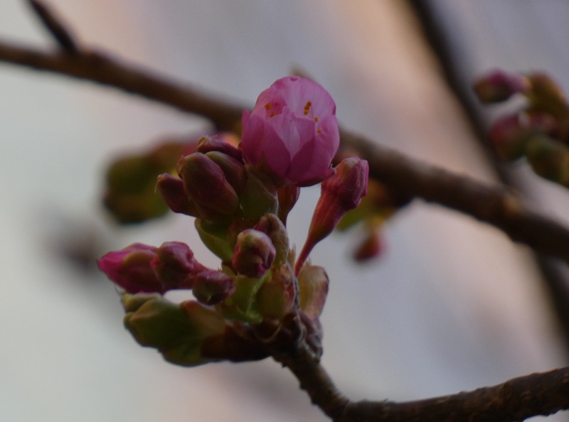 この河津桜、春を告げる花として毎年開花を楽しみにしている樹です。先週末から、つぼみがほころび始め、淡いピンクの花が!うれしい春の便りです。