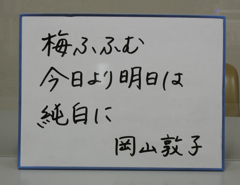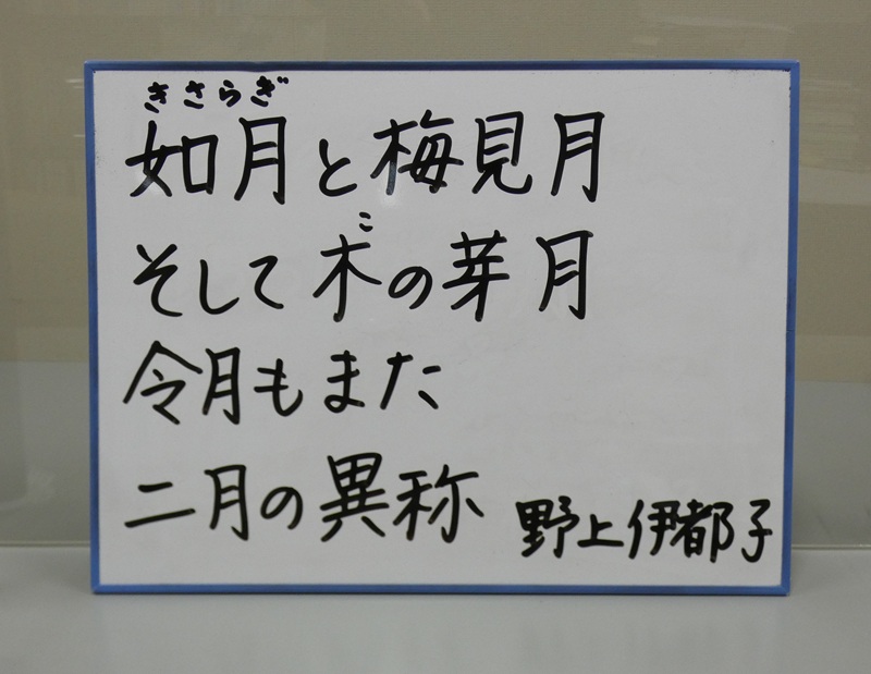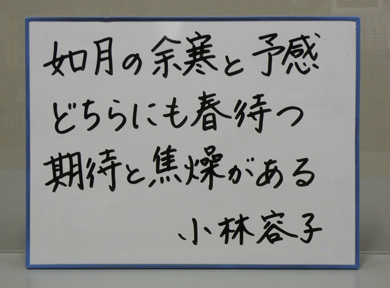 2月に入りました。小さな白板、「如月」「早春」「余寒」「梅」「椿」…二月ならではの題材・言葉が詰まった俳句と短歌が並びました。