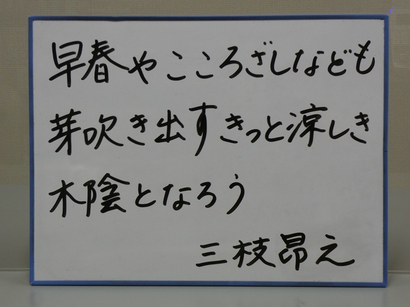 芽吹く季節、「こころざし」もこの季節に芽吹いて、やがて枝を伸ばし、木陰を作るくらいの大きな樹木になっていく…未来を想像している作者。希望にあふれた短歌です。皆さんの志も、これから大きく伸びていくのです。