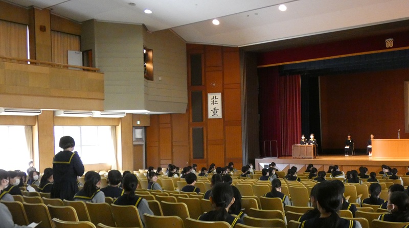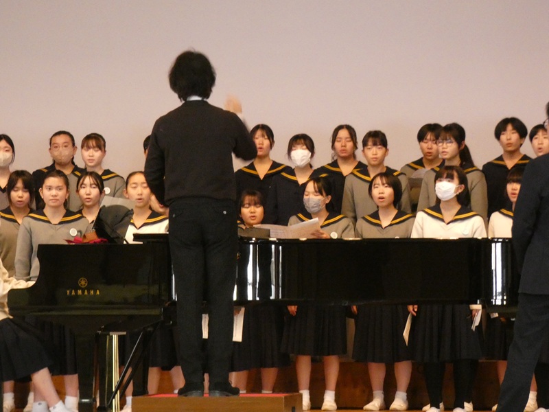 中学生は、講堂の舞台に集まって、3月3日の創立記念式で披露する合唱の練習に励みました。きれいな歌声に仕上がってきました!心を込めて練習です。