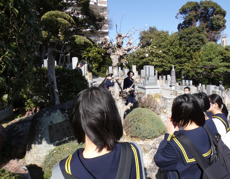 午後、高校3年生は、創立者岡本巌先生と二代目校長の富郎先生の墓前に、卒業の報告に伺いました。