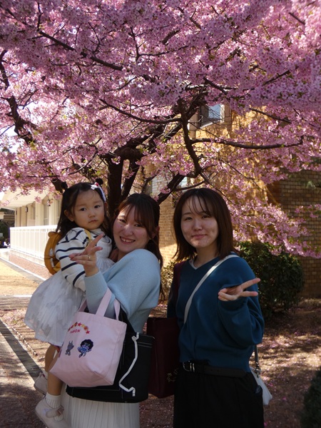 中村学年の卒業生が土曜の学園を訪ねてくれました。満開の河津桜の下で。