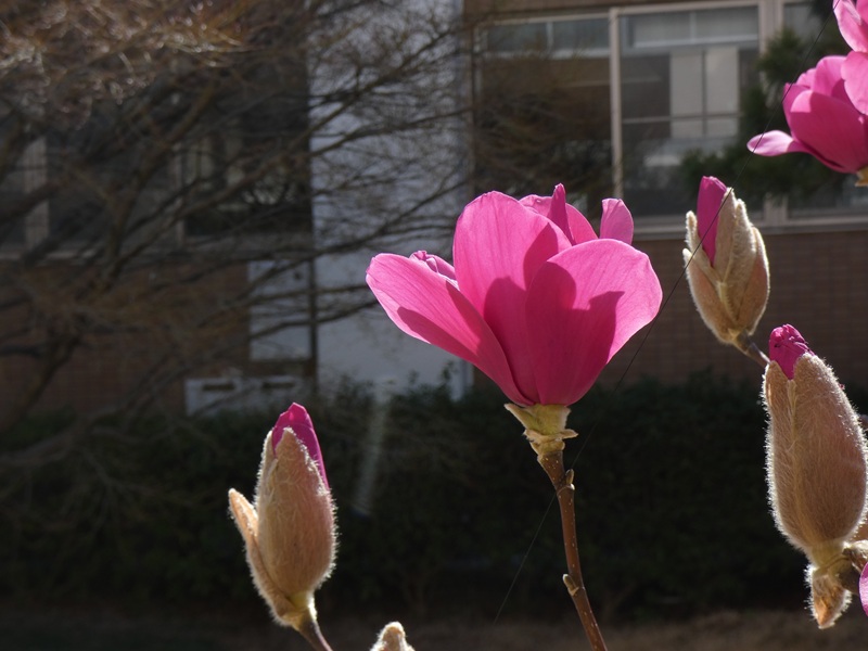 このガールマグノリア、よっぽど花がおいしいのか、毎年ヒヨドリの襲撃に遭っています。ヒヨドリが花芽を食べてしまうのです。今年は、講堂外壁に修繕工事の足場が組まれたことが幸いして、足場が鳥たちの襲撃を食い止めてくれていたのですが、足場も取れて、鳥たち、舞い戻ってきました~!