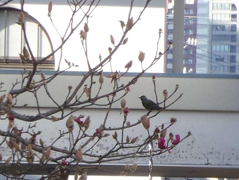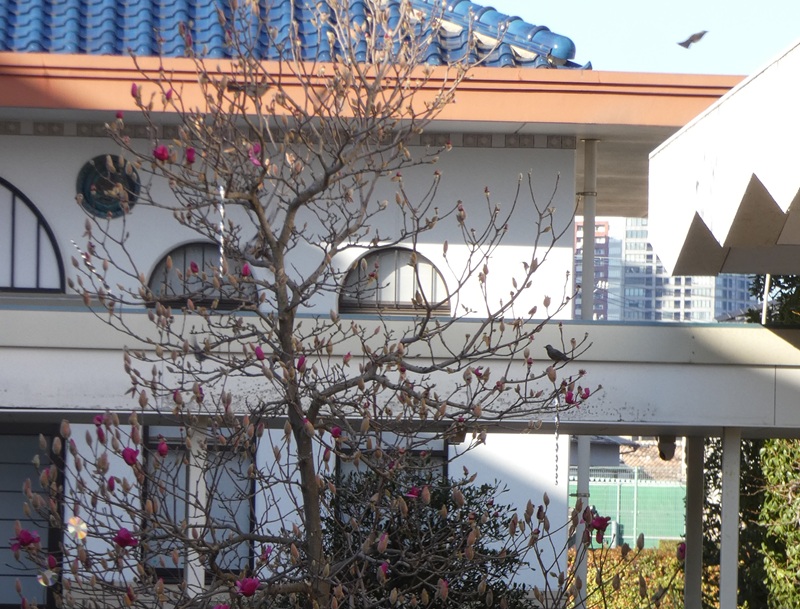 この時期、オオバは鳥追いオバサンになります。ガールマグノリアにとまった鳥たちめがけて全力疾走し、鳥を追い立ててます。紅色の美しいガールマグノリアを守らんがため!