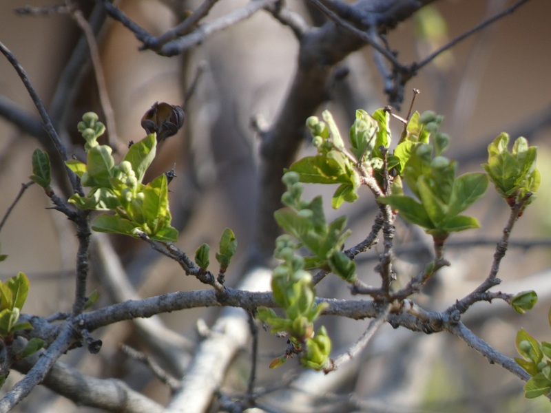 正門脇のリキュウバイにも緑の若葉が。もうすぐ白い花が咲きます。楽しみです。
