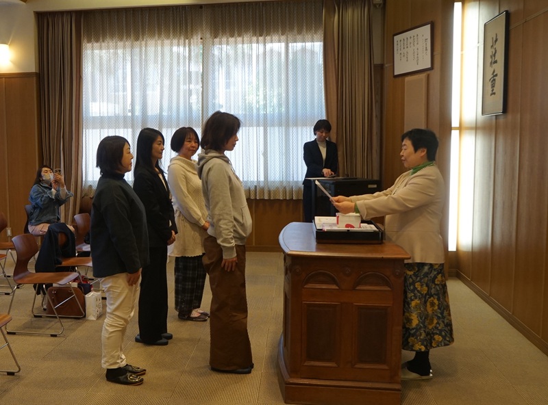お嬢さんが入学してから6年間母親学級に在籍したお母さん4名の表彰です。