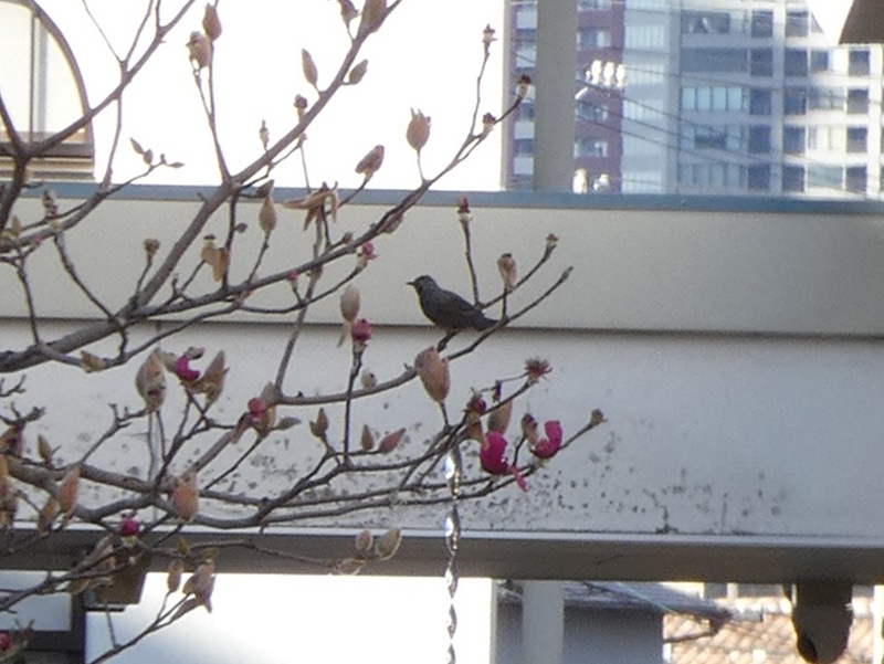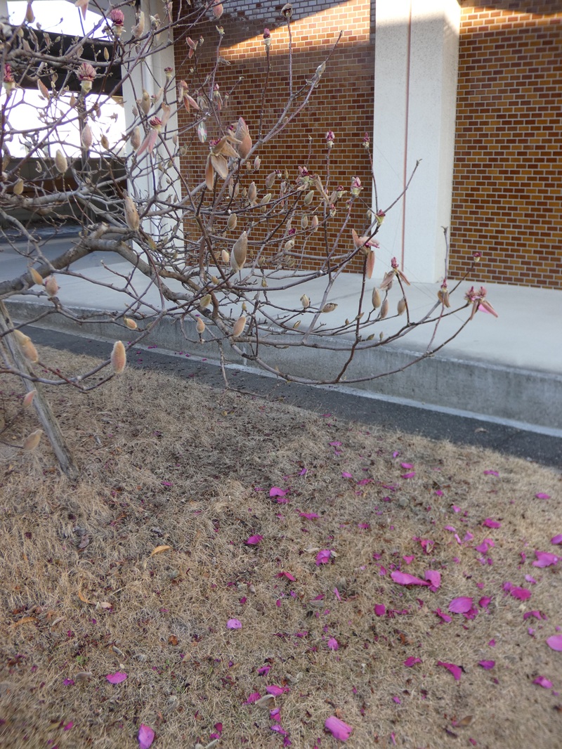 最初にご紹介した写真は、3月11日の朝撮影したものです。今朝は、一つの花もなく、すべて食いちぎられ、地面にはたくさんの花びらが…。
