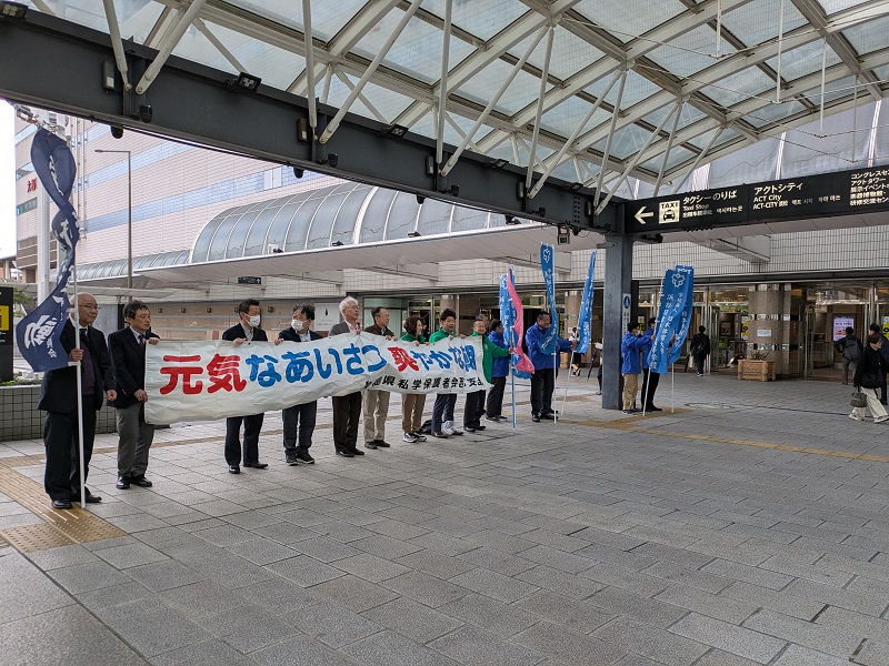 私学西部支部保護者会では、毎年4月に、浜松駅前(北側)で「朝の声掛け運動」を行っています。今年は、明日14日の朝行います!