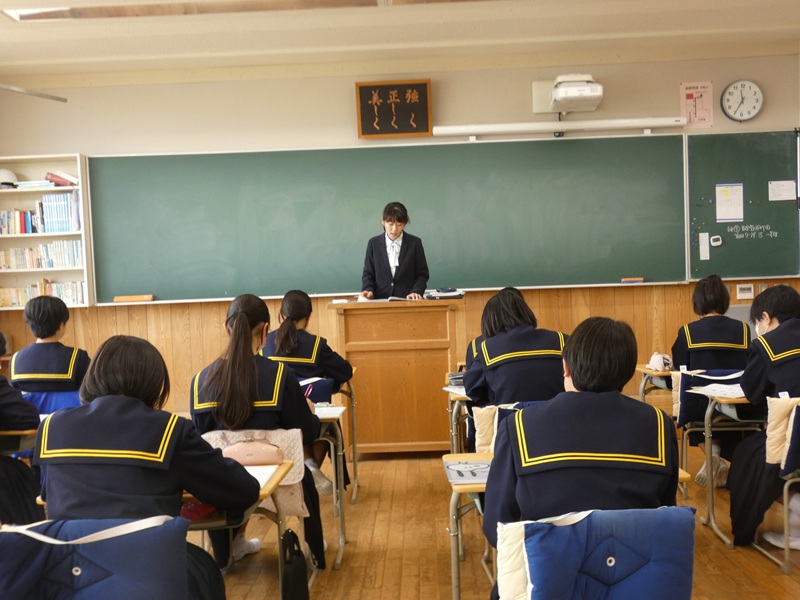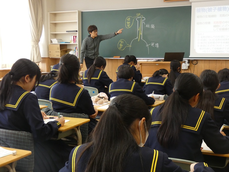 中3は理科。花の仕組みを真剣に聞き、めしべの柱頭から下に伸びていく花粉管にびっくりしている生徒たちでした。