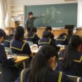 こうした言葉の数々が、西遠女子学園を作っているのだということ、「草にも木にもいいことをしよう」の精神が「学園」と呼ぶにふさわしい美しい環境になっていること…。そのうえで、生徒の皆さんには、「学園を美しく保つ」ことについて何枚かの写真を提示して考えてもらいました。最初に使ったのは、2014年の写真です。