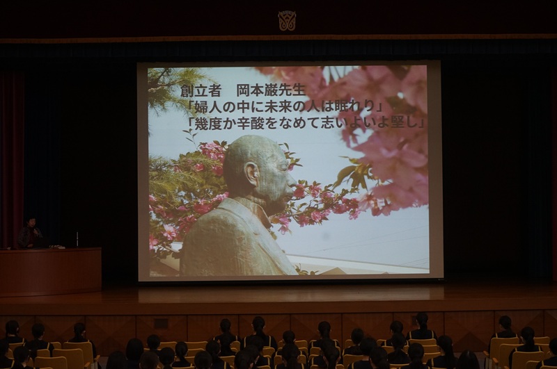 次にお話したのは、「創立者の言葉」「先人の言葉」です。岡本巌先生が残した言葉や建学の精神、校訓、そして岡本富郎先生の「学園の歴史と伝統」「草にも木にもいいことをしよう」を取り上げました。