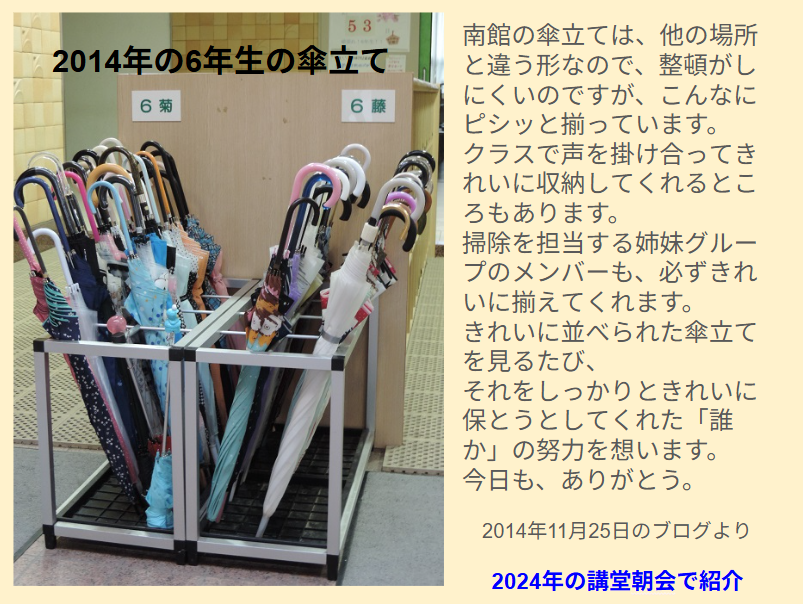 この写真を見た先輩が、傘立ての美化に努めてくれたことも紹介しました。先輩たちの「美」への努力を受け継いだ生徒たち。その精神を今学園に通う全校生徒に受け継いでもらいたいと思います。